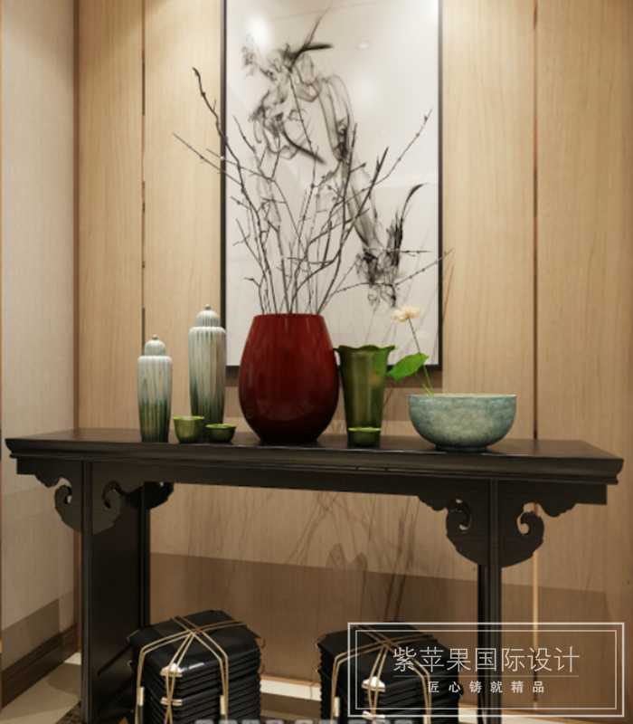 主人對(duì)于風(fēng)水頗有講究,自身五行屬土,所以我們?cè)谠O(shè)計(jì)時(shí)家居整體色彩上以大地色系為主。梨花木色的門(mén)配以局部的原木色的墻飾將低調(diào)、儒雅慢慢呈現(xiàn)。加上富有細(xì)節(jié)的條案、餐椅將新中式的文化氣息得到升華。整體有如一幅山水畫(huà),值得人慢慢品味,經(jīng)久不衰。又如一碗茶,一口清淡,再品醇厚,齒頰留香。