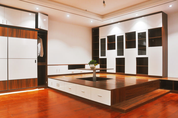 (1)次臥可以做榻榻米,現(xiàn)在的榻榻米基本都是定制,可以卡墻做,不浪費(fèi)空間,榻榻米高度一般在400mm-450mm,內(nèi)部箱體可以用來存放過季的被子,衣物等。且榻榻米上面還可以做衣柜書柜等,空間利用率非常高。