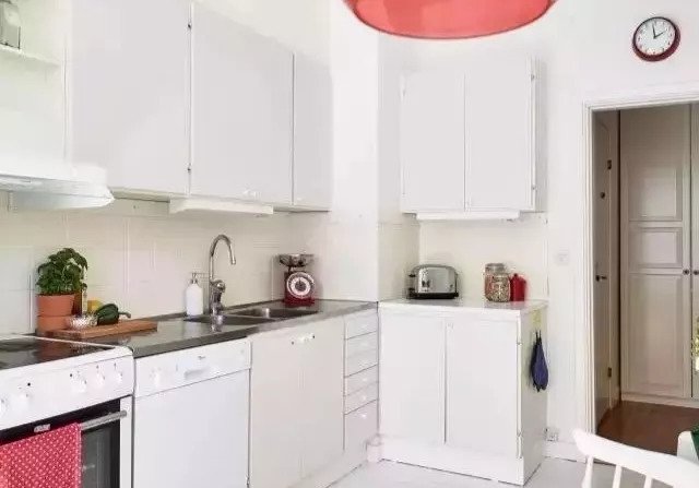 如果覺得櫥柜顏色有些單調(diào),這個時候可以用局部亮點來點綴:餐具、臺面、電器、花卉都是搭配利器。你想得到的都可以用得上。
