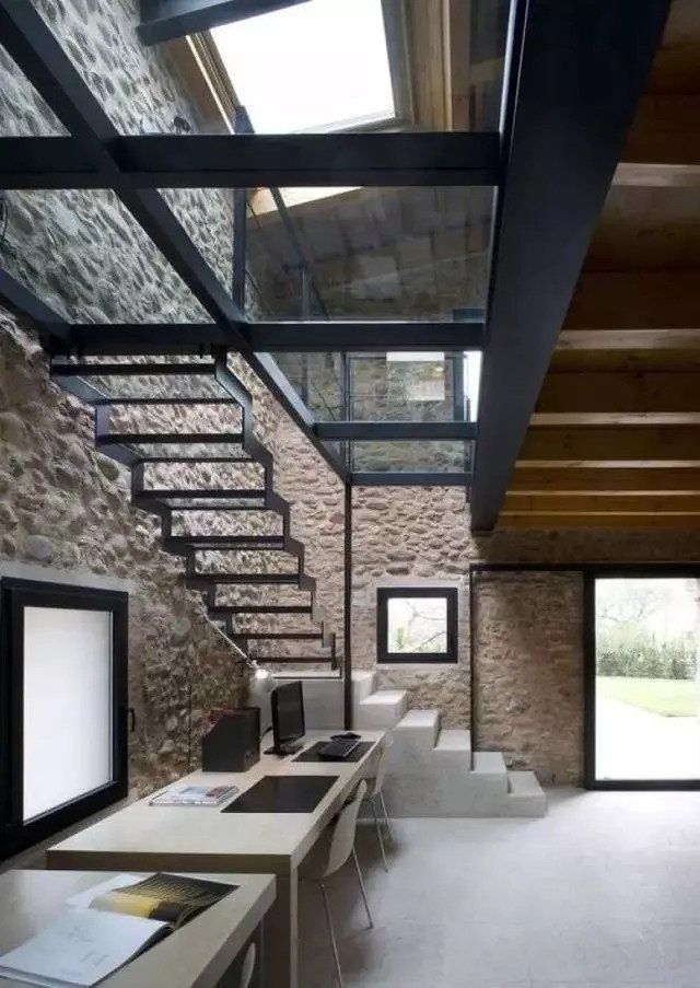 比如木質(zhì)的樓梯噪音大,鐵質(zhì)的扶手冰涼, 拋棄兩者的缺點(diǎn),把優(yōu)點(diǎn)結(jié)合起來(lái),就是很好的組合。其他還有木質(zhì)跟玻璃、大理石跟玻璃等。