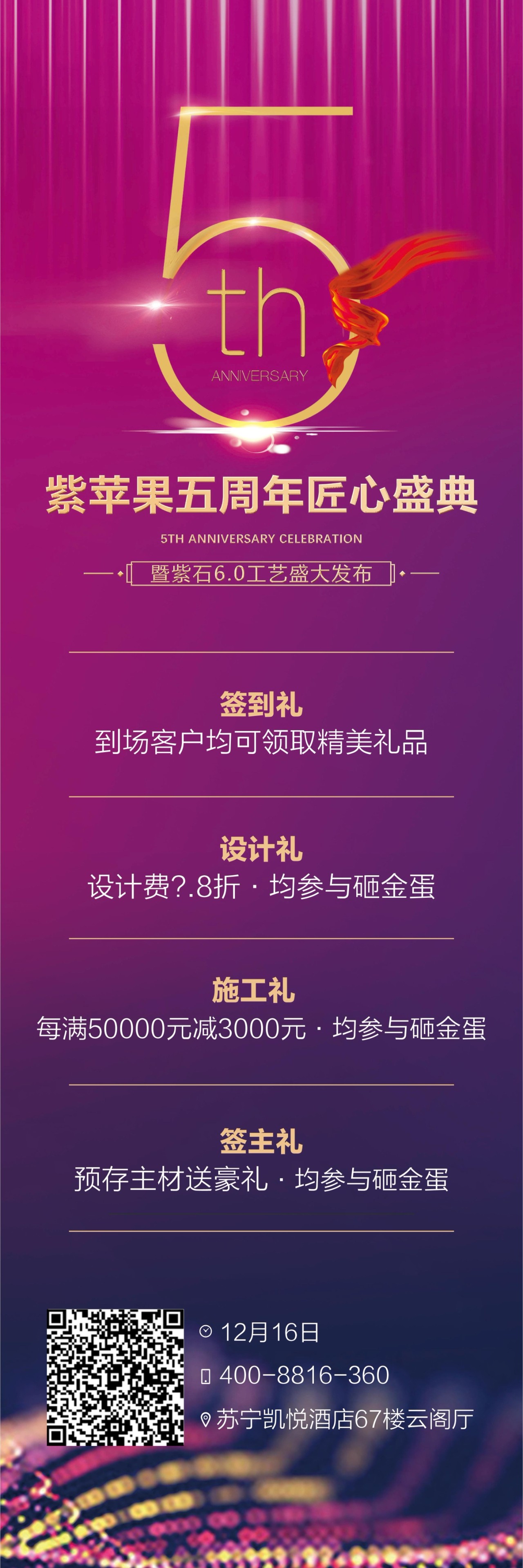 紫蘋果即將迎來無錫公司5周年慶典,感謝您一直以來對(duì)我們的鼎力支持,為表達(dá)我們對(duì)您的感激之情,特借此次周年慶,邀您光臨“蘇寧凱悅酒店67樓”,分享我們的快樂!