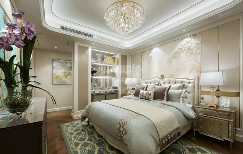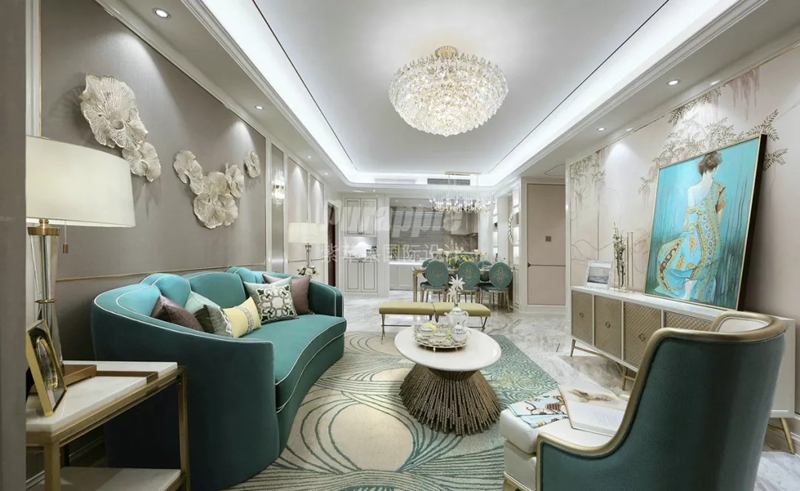 本案戶型方正,動(dòng)線明朗,因此設(shè)計(jì)時(shí)在結(jié)構(gòu)上未做過(guò)大調(diào)整??臻g整體以白色與米色大面積渲染,同時(shí)穿插少許奢華的金色點(diǎn)綴空間,整體色調(diào)更加豐富而高級(jí)。地板選擇了大理石系,軟裝則以藍(lán)色色系修飾空間,通過(guò)色系的延伸,保持空間跳色風(fēng)格的連貫性。