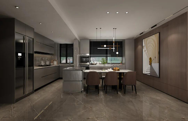 開(kāi)放式餐廳讓人自在不拘束,與廚房緊鄰,可以家人間方便溝通交流,簡(jiǎn)潔的吊燈與巨大的藝術(shù)掛畫(huà),給深色調(diào)的空間增添活力與趣味。