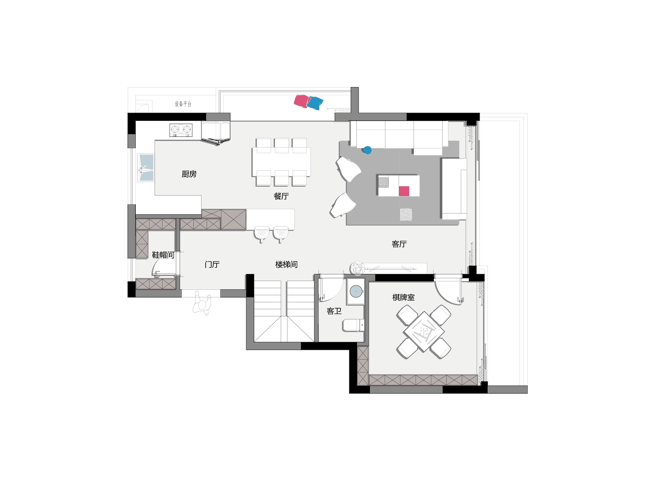 一層方案,一稿是做了一個半開放式廚房,北面做了一個次臥可以方便老人居住,沒做老人房的一稿方案把陽臺打通,是一個開放式廚房,餐廳連在一起的長島臺,南面是一個棋牌室或多功能區(qū),品質(zhì)很高。