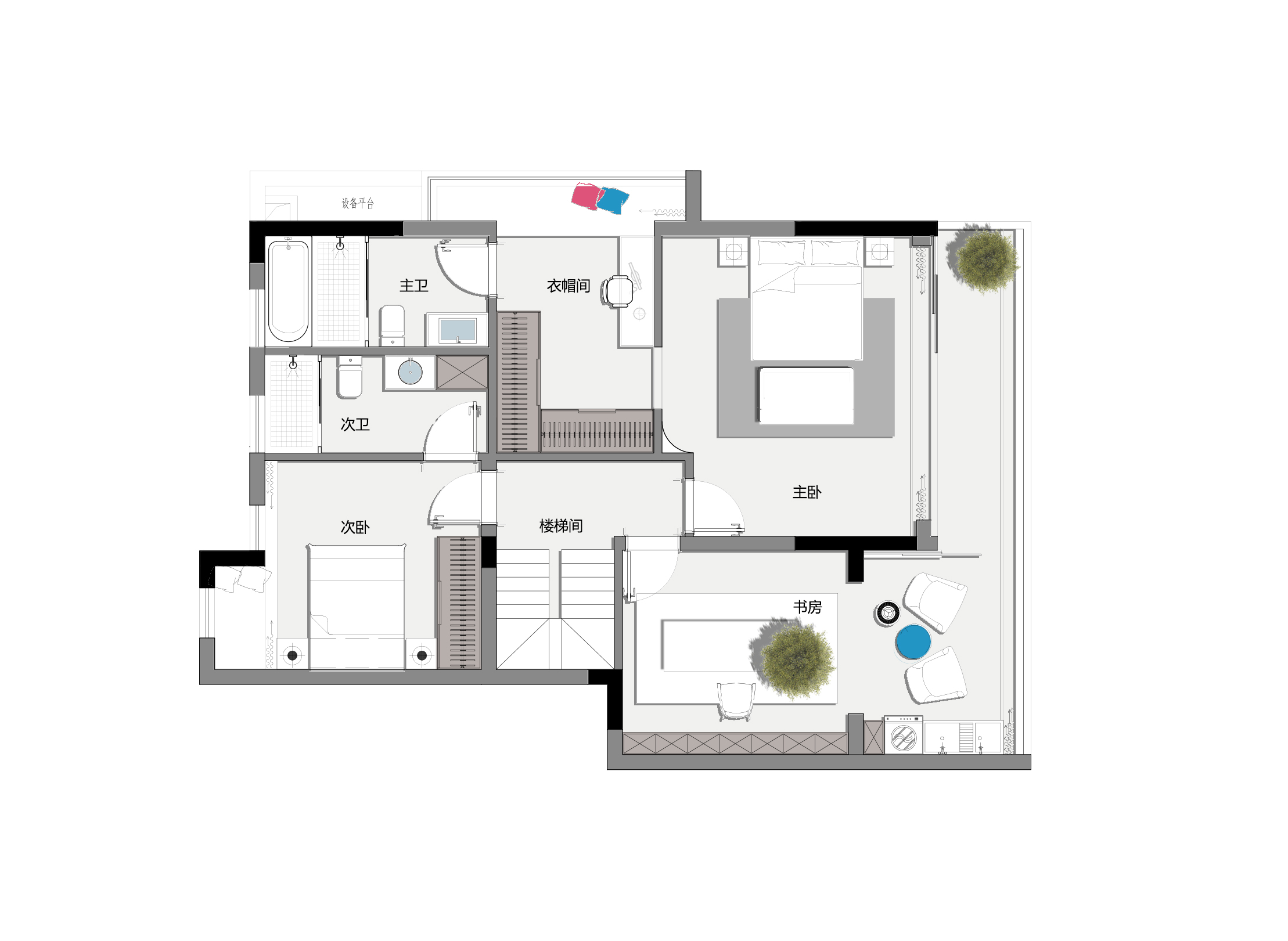 層是主要的休息區(qū),方案一做了兩個起居室,一個大套房,另一個方案則做了一個書房,一個大套房,一個次臥。