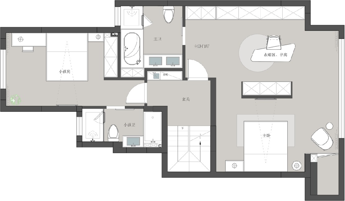 4?二樓作為主要的休息區(qū),是一個(gè)大套房和小套房,滿足了日常的人口居住需求,同時(shí)提升了生活品質(zhì)。
