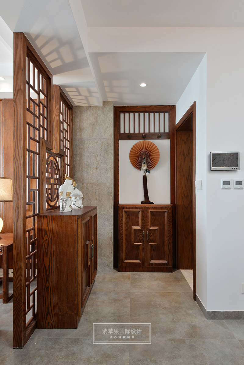 一入門,設(shè)計(jì)師用中式木格花簡(jiǎn)單隔斷,將玄關(guān)勾勒出來,又利用木格花的通透不隔斷客廳與玄關(guān)的聯(lián)系,形成了一個(gè)相對(duì)通透的空間,再簡(jiǎn)單擺放一個(gè)純正中式風(fēng)格的玄關(guān)柜和鞋柜滿足日常生活需求,就將玄關(guān)完整表現(xiàn)出來,簡(jiǎn)單獨(dú)特有趣味。