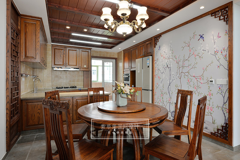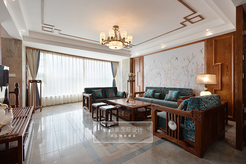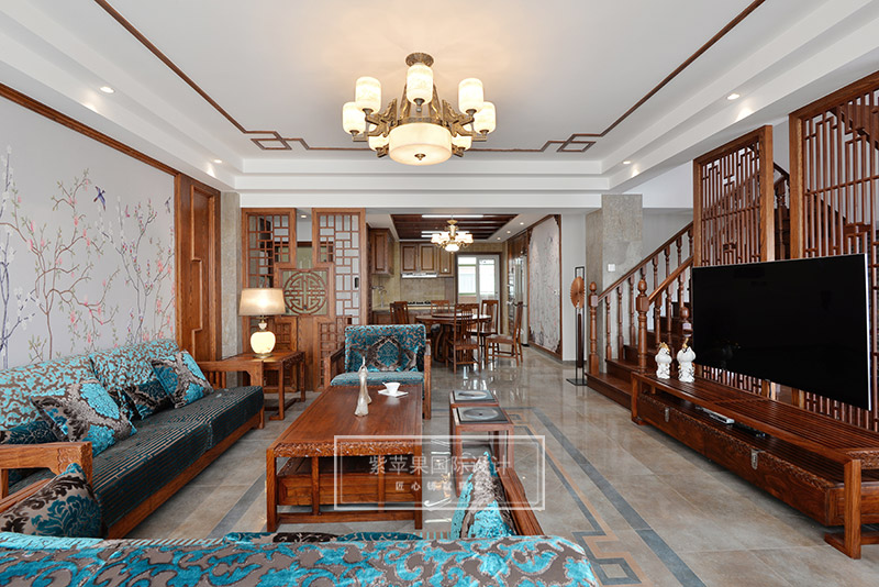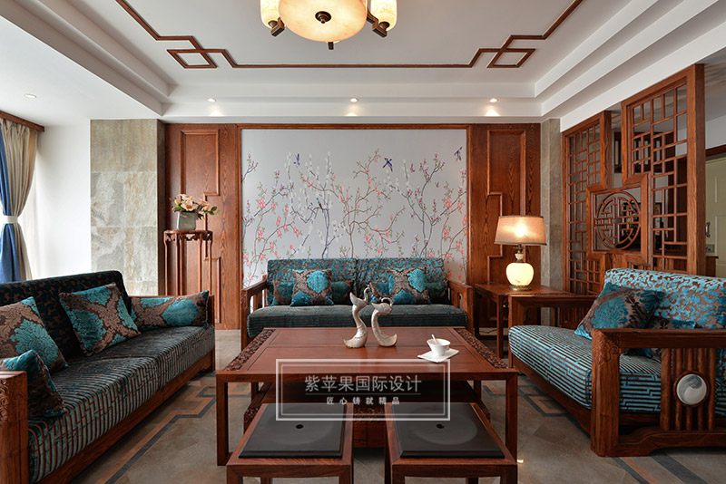 客廳的回紋吊頂和中式吊燈,搭配傳統(tǒng)韻味中式家具,形成了一個(gè)古雅清新極富傳統(tǒng)魅力的客廳空間??蛷d家具實(shí)木色澤,細(xì)致做工,花紋精美,散發(fā)著古色古香的韻味,與背景墻上灰色花鳥主題的花紋相互映襯,感受清雅精致,溫馨愜意。