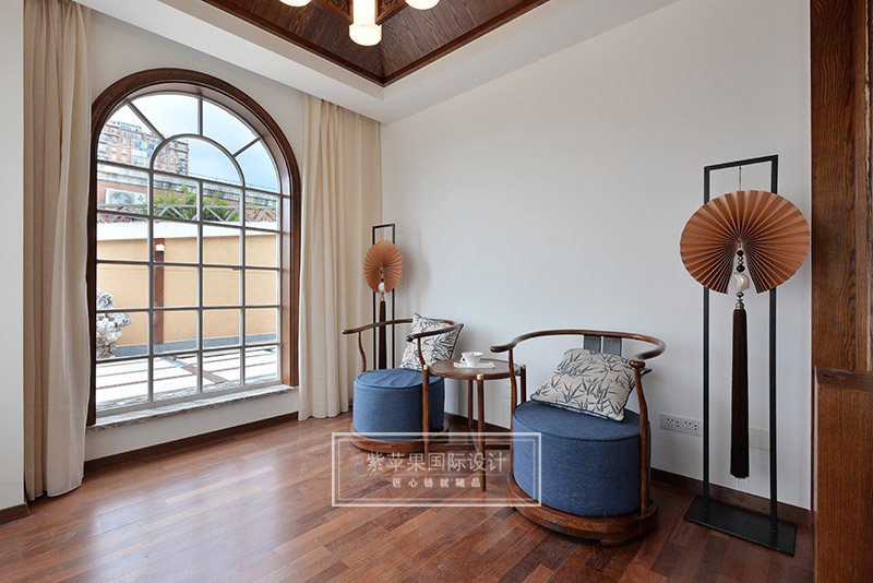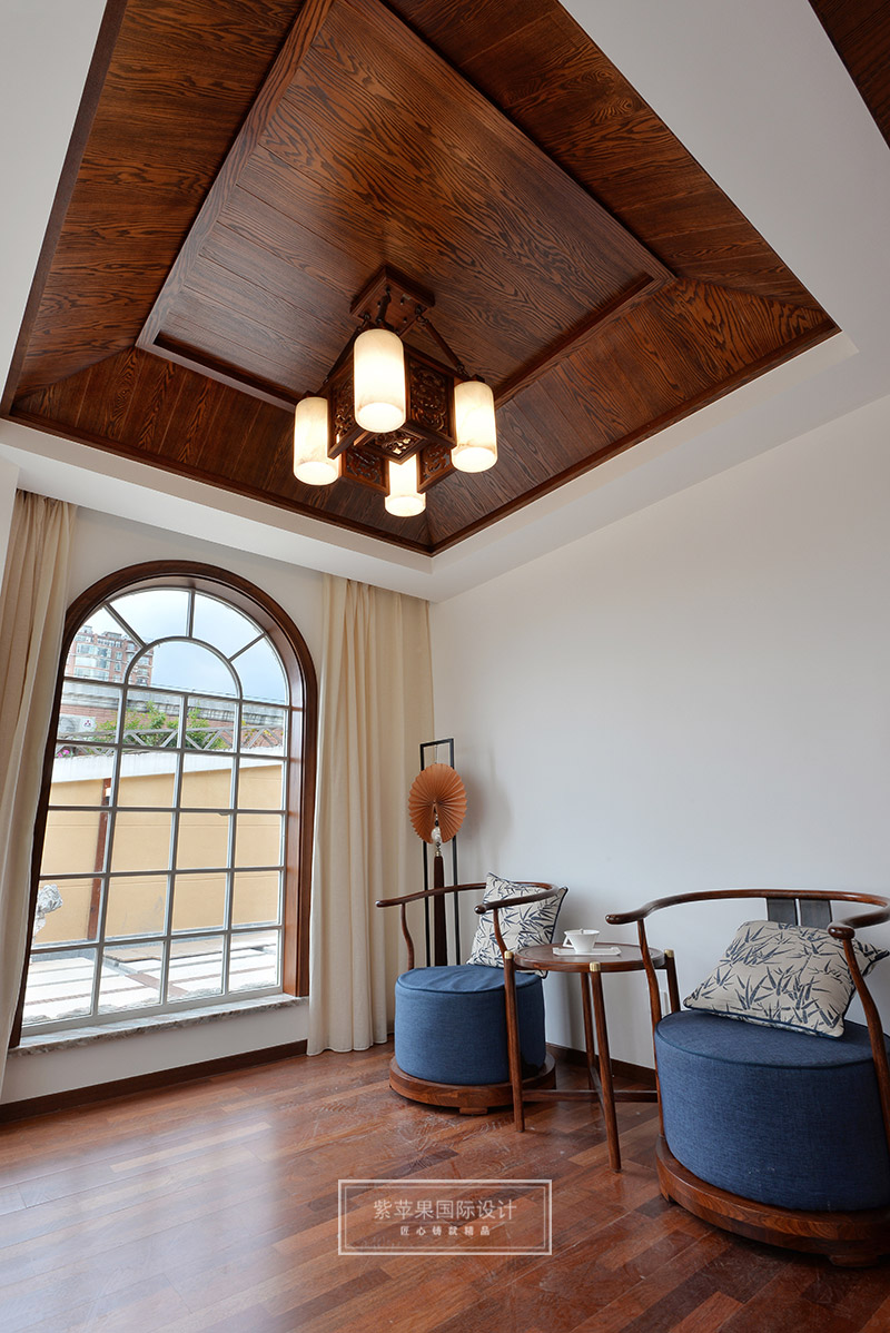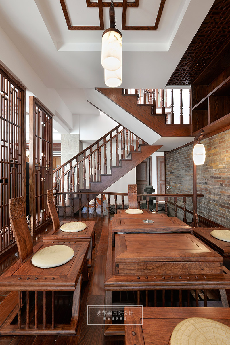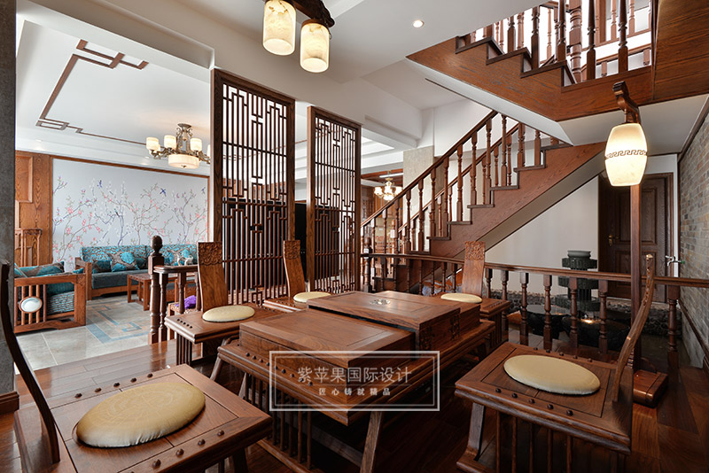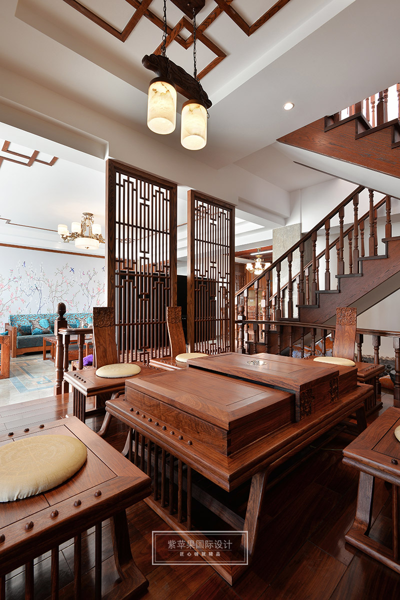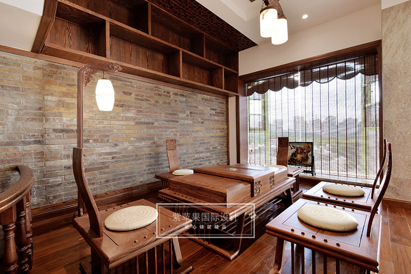 茶室與客廳也是運(yùn)用木格花進(jìn)行簡(jiǎn)單隔斷,運(yùn)用地面材料的變化進(jìn)行空間劃分。茶室空間延續(xù)客廳實(shí)木色調(diào),因?yàn)槠凡璞旧淼钠骶邥?huì)非常多,茶室的裝飾方面則變得簡(jiǎn)潔起來,選用的家具都是線條比較流暢、造型簡(jiǎn)單的中式家具,雖簡(jiǎn)單卻不失韻味。茶室旁邊還有個(gè)室內(nèi)假山的景致,與家人或是親朋品茗聊天之時(shí),又可聽到潺潺水聲,更有一番世外桃源的感受。茶室墻面保留了原有的銹石磚紋路,保留了老房子氣息,復(fù)古又有韻味。特別放置的吊燈和宮燈,也作為點(diǎn)睛之筆,為整體空間增添古色古香的傳統(tǒng)氣氛。