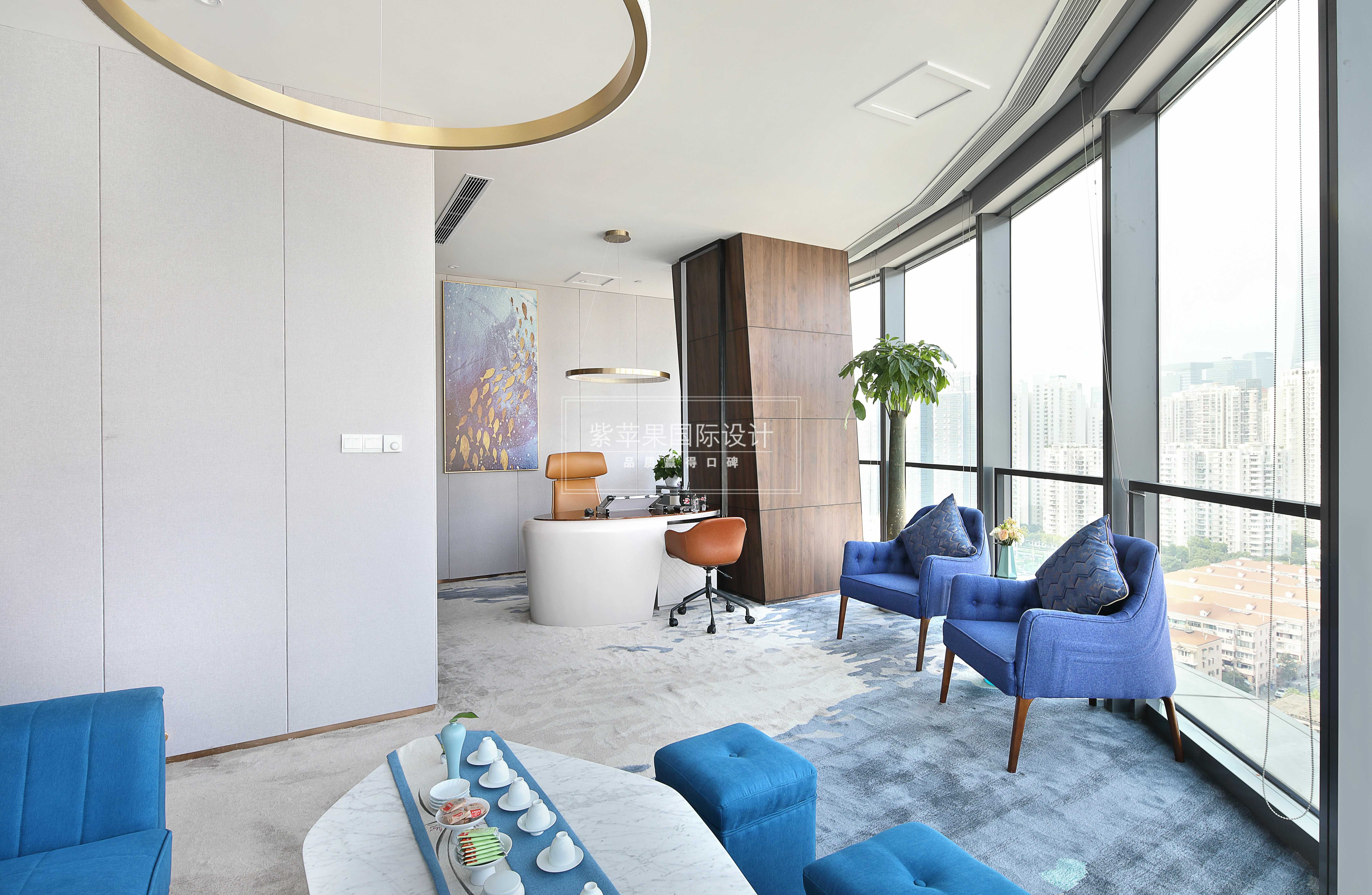 藍(lán)色潑墨圖案的地毯為通向其他場所巧妙的設(shè)置出了一條引導(dǎo)路線,也將辦公區(qū)域和前臺接待區(qū)很好地隔離開來,劃分功能區(qū)的同時也保證了美觀性。