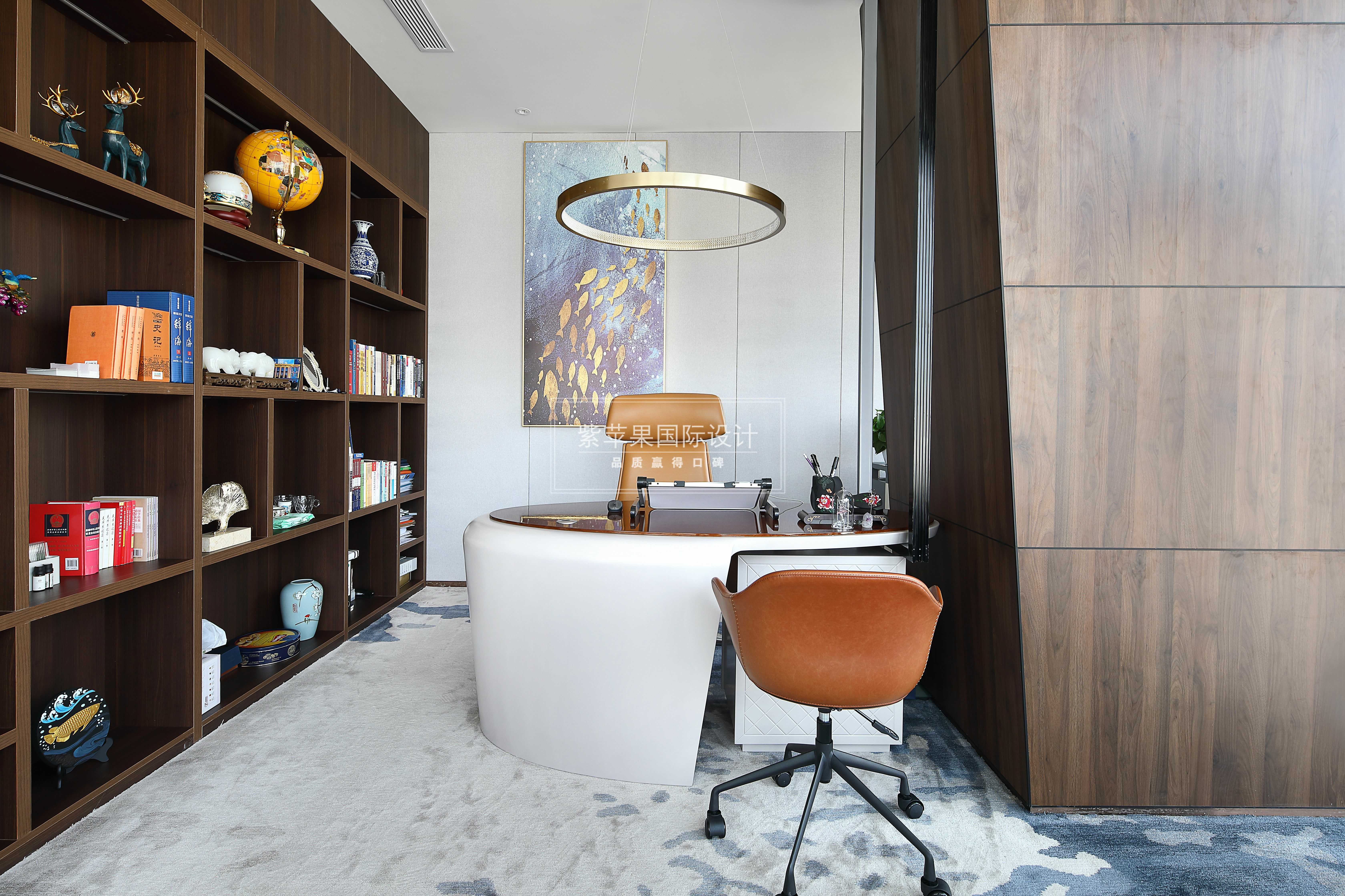 董事長辦公室呈半環(huán)形,空間理念延續(xù)整體場所的設(shè)計,金屬材質(zhì)注入了現(xiàn)代元素,木質(zhì)為空間帶來了沉穩(wěn)內(nèi)斂的感受。